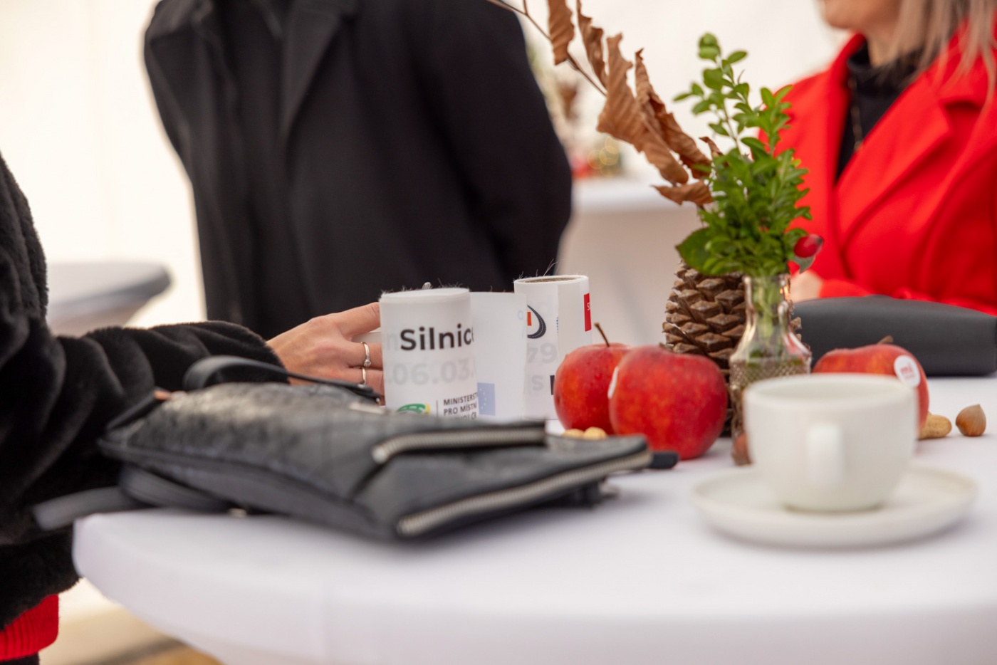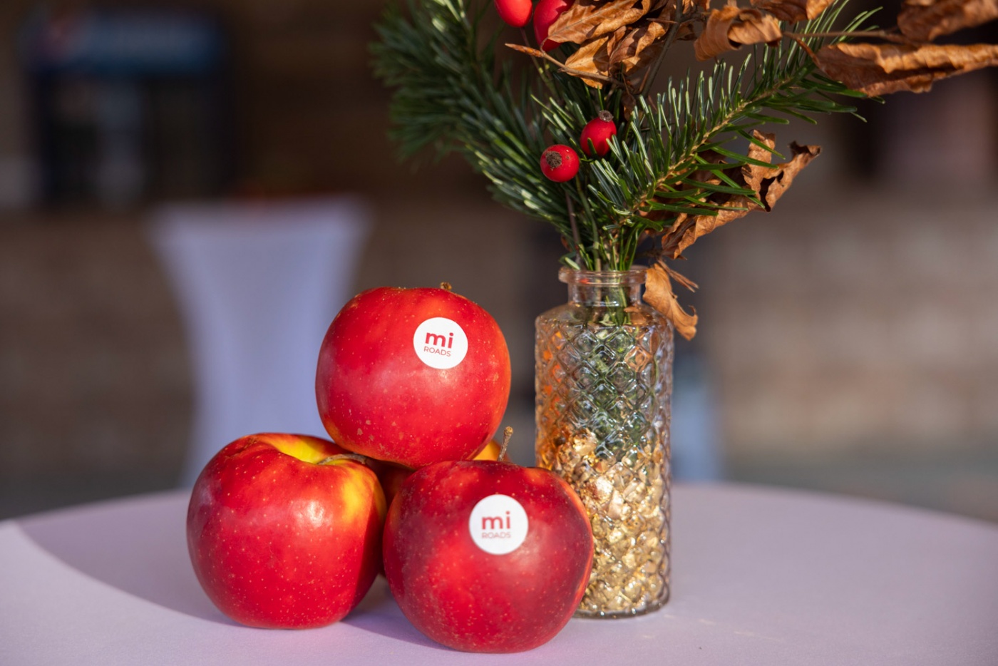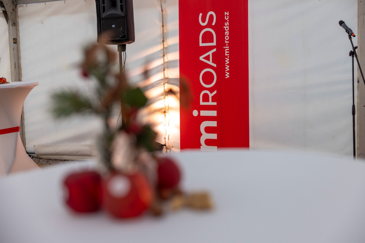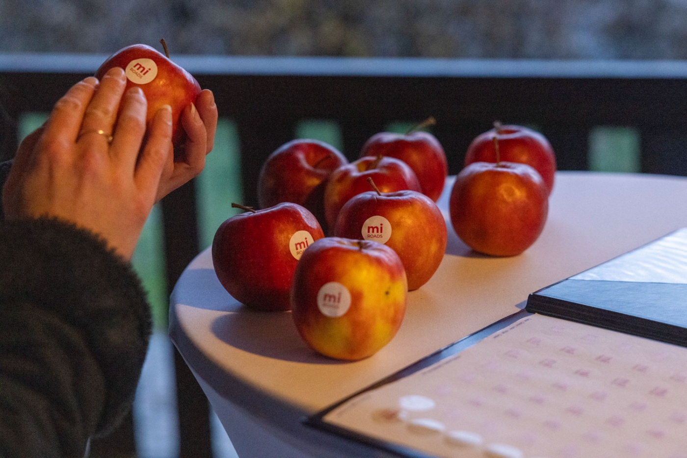 V den D, přímo na místě, to žilo od brzkého rána: nosíme, stěhujeme, pouštíme topení, ladíme catering, hosteskám rozmrazujeme úsměvy, testujeme ozvučení a těšíme se na první hosty. Všechno do stylové červené – barvy MI Roads – a do toho červená lažanská jablka, která provoněla celé zázemí. V 9:30 přichází první hosté a my si říkáme: jo, tohle bude dobrý den. A byl.